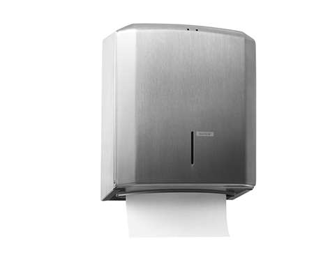 Dimensions: 330 x 275 x 120mm. Distributeur d’essuie-mains élégant. Pour 2-3 unités de conditionnement. Acier inoxydable brossé (argent). Robuste et fiable. Le hublot permet de savoir quand recharger en papier. Montage, remplissage et entretien faciles Verrouillable.